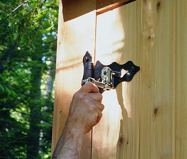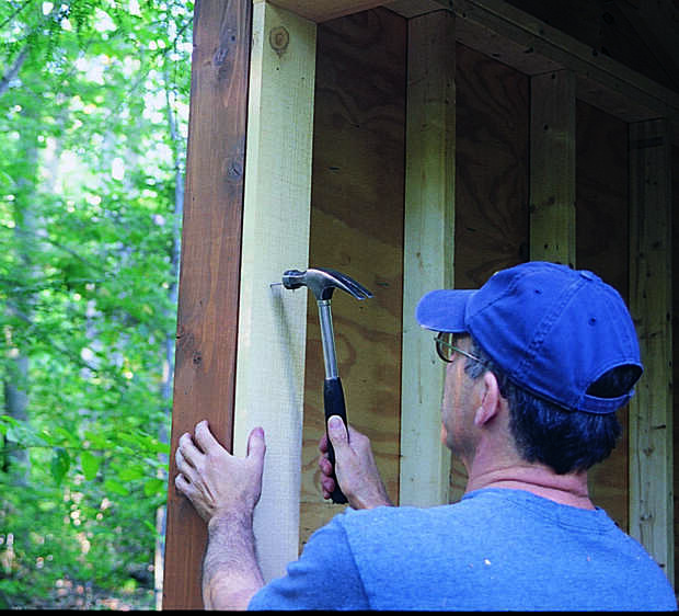Mantener las bisagras en su lugar y marque los agujeros de montaje. Diámetro orificios guía y fije las bisagras a la vertiente de la. Coloque la puerta con un espacio de 1/4 pulg en los lados y la parte superior y marque los orificios de la bisagra. Agujerear los agujeros piloto y Monte las bisagras (Foto 2). Instale el tirón de la puerta y cerrojo. Corte el doorstops y clávelos en su lugar en la parte superior y la jamba del lado abierto. Luego, teñir o pintar las ventanas, puerta y moldura restantes.