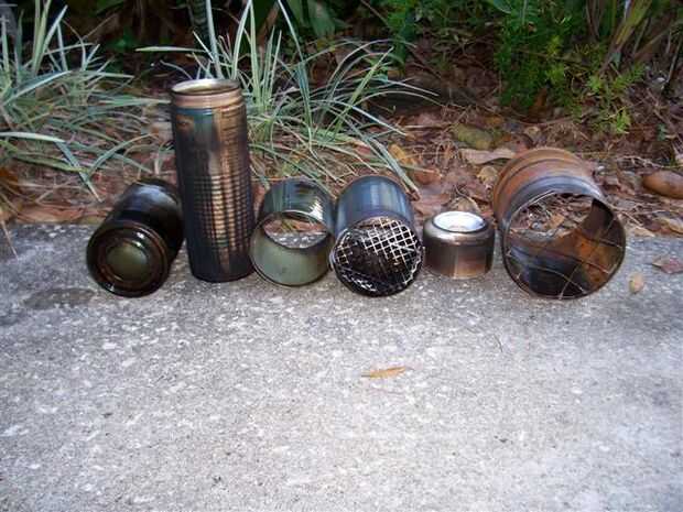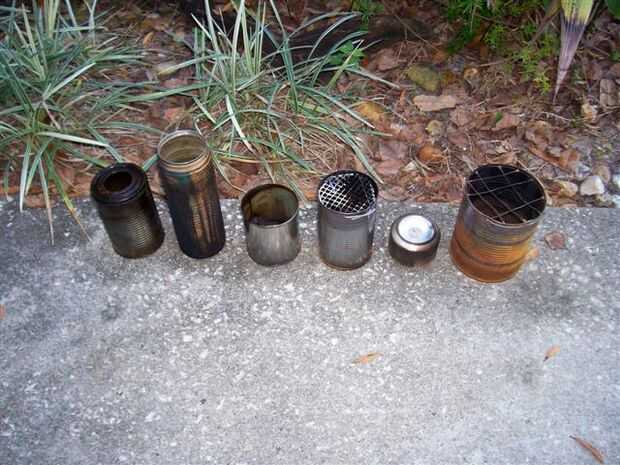 A partir de la izquierda con el pasado puede - una lata de vegetal mixta, aparece boca abajo con el corte superior y corte un orificio de 1-1/2" en la parte inferior. Los orificios son fáciles de cortar utilizando en primer lugar un punzón a golpear puntos en un círculo de 1-1/2", que son luego conectados a cortar con un cuchillo.
