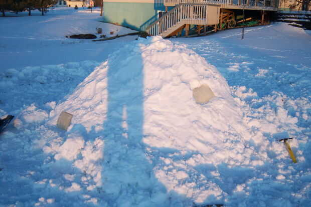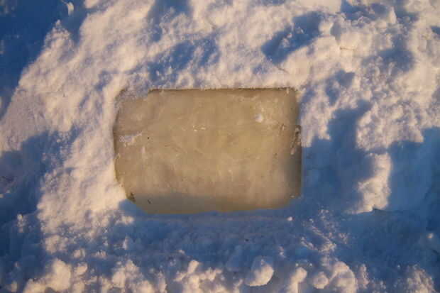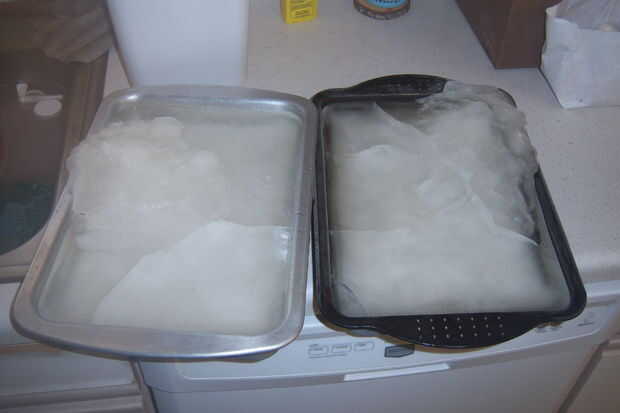 Una vez congelado, ejecutarlos bajo agua fría del grifo hasta que se encuentran libres de las cacerolas, y ahora están listos para instalar tus windows. Solo corta unos agujeros de la ventana en su quinzhee y paquete en (pero tenga cuidado de no dañar la integridad estructural de la cúpula)