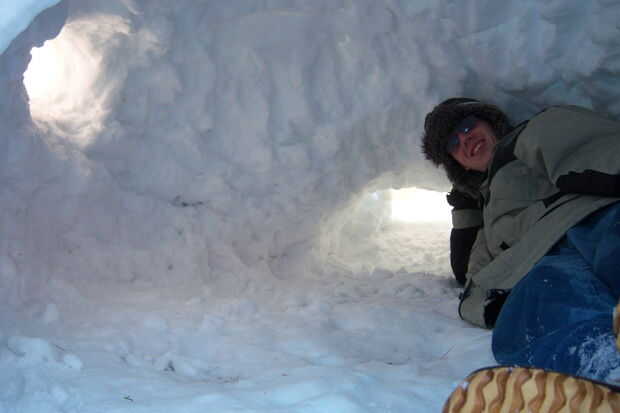 Si tienes el tiempo, windows de hielo cristalinas son las mejores y realmente hacen su quinzhee brillar. Sólo utilizamos hielo normal turbia, pero como se puede ver en las fotos incluso nubladas windows son sorprendentemente grandes en iluminar el espacio interior. Supongo que nuestro 'sunroof' más que 'ventana'.