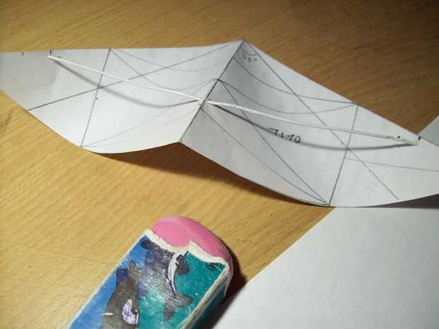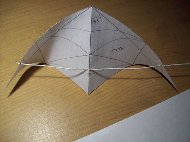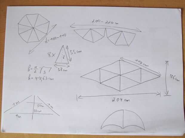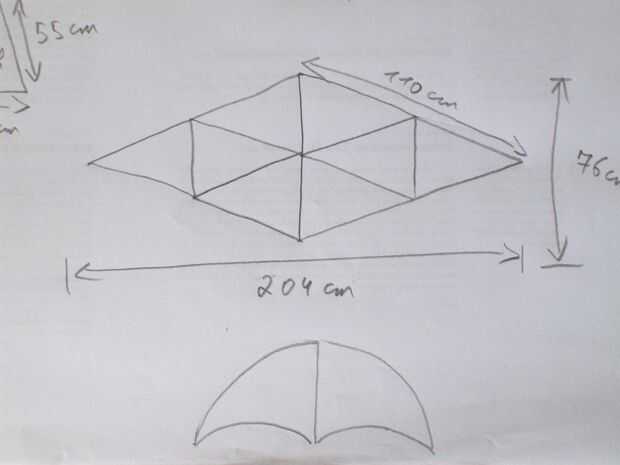 Desde sombrillas todas montan una forma octogonal, pensé que una forma de utilizar la mayor parte de la tela. Desprendiendo el tejido en 8 triángulos iguales puede reorganizarlos en forma de rombo "delta kite amigable". En mi caso esta fue la decisión solamente razonable, puesto que el diámetro de la tela era solamente cerca de 1m. Si el paraguas es más grande que la mía, puede cortar a la tela sin separarlo y diseñar tu propia cometa! Para mejor visualización de la cometa terminada, he construido un 1:10 escala.