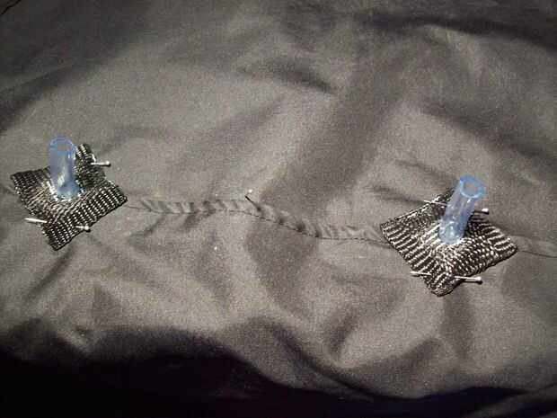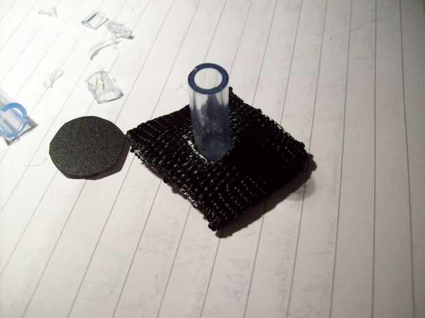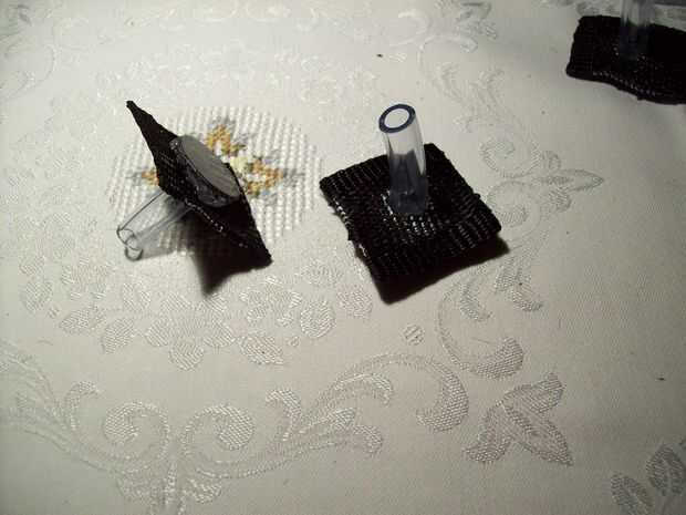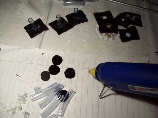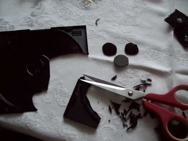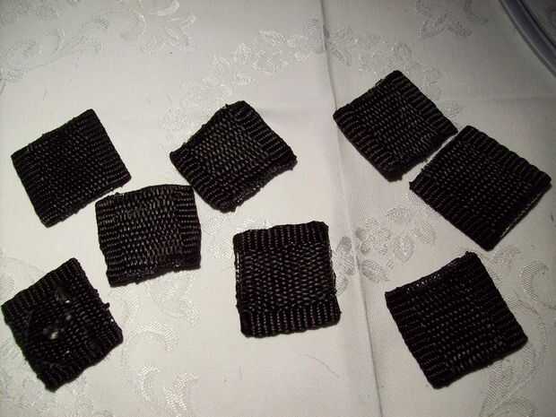 Primero de corte 6 formas cuadradas iguales fuera de la correa de plástico sobrante. Luego cortar un agujero en cada uno de ellos y derretir los cortes con su vela. A continuación coge la placa trasera de la caja del maxi-CD y cortar 6 formas de círculo pequeño con un par de tijeras, que deben ser la mitad de las plazas. Ahora tendrá 6 fragmentos de la manguera de goma fina tamaño 4,5 cm. cortar 3 patas en el snip y fíjelo al círculo con una carga de pegamento caliente. Si está hecho, sacar estos recortes aunque el agujero de sus pequeñas plazas. Por último coser estos 6 link-ups a la tela con una costura de zig-zag, como su muestra en la imagen.
