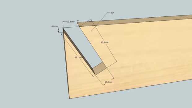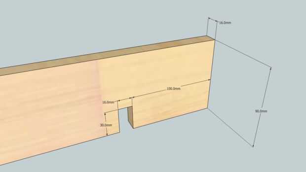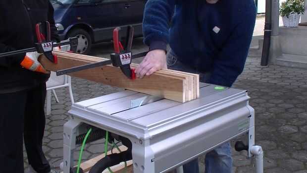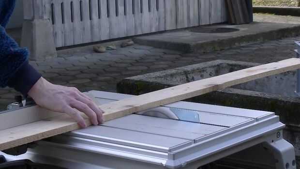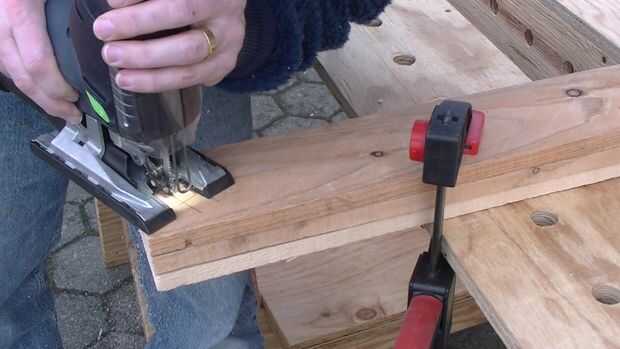 Primero los tableros se cortan a la longitud. Luego se cortan muescas para las tablas normales. Finalmente las ranuras diagonales para los tableros de frente se cortan con la sierra caladora.