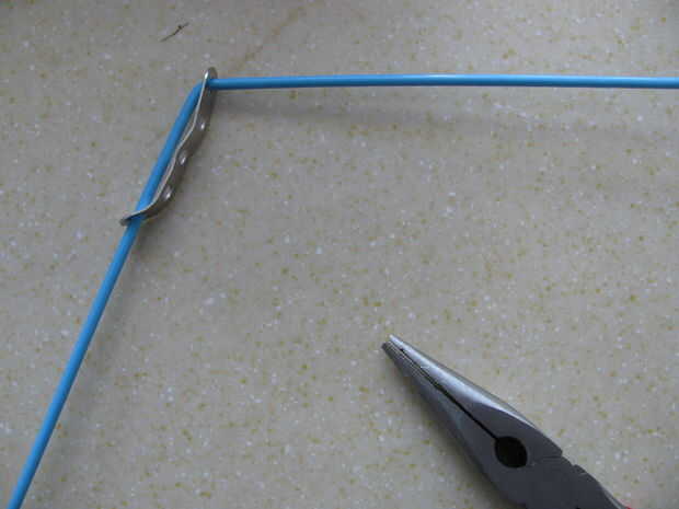 Utilice uno de las 5 orificios Erector set las tiras de metal y doble en forma aproximada como el retén de la izquierda.