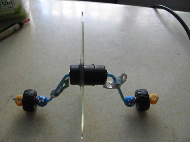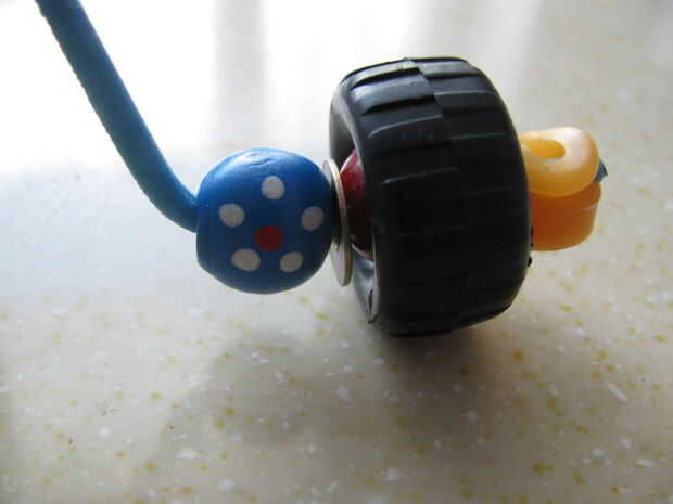 La segunda foto muestra closeup de ruedas - en el interior de cada eje, que utilicé un cordón como cuentas que las niñas les gusta usar para hacer pulseras. Usted puede utilizar arandelas ni nada la voluntad de permitir que la rueda gire sin unión en la curva en el eje de la percha.