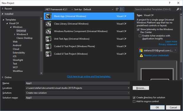 Paso 2: Crear una aplicación Universal en blanco de Windows con Visual Studio 2015