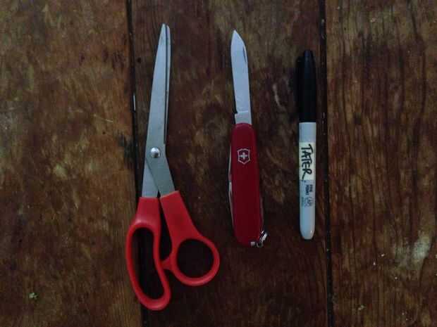 Siempre llevo un rotulador y una navaja conmigo, así que ya tuve esas herramientas. Más tarde encontré un par de tijeras cuando estaba buscando palillos de dientes - así que comencé a usarlos.