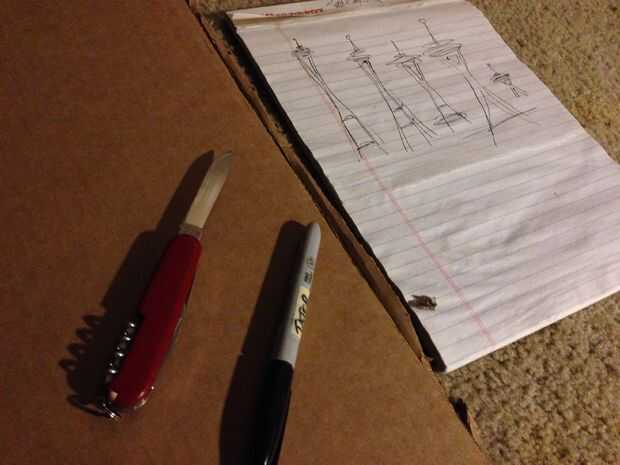 Miré por la ventana en la aguja del espacio y elaboró unos bocetos, cogió uno me gusto y lo dibujó en la cartulina. Lo hice todo a mano alzada y decidió añadir el hombre dentro de la aguja del espacio para mezclar los dos iconos.
