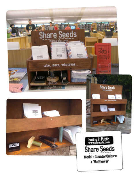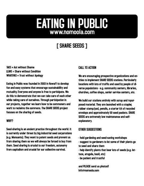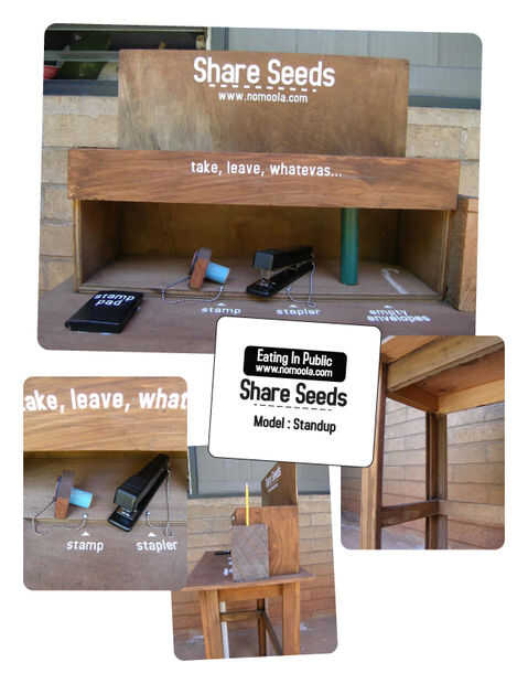 Estaciones de compartir semillas esperan fomentar el ahorro y la distribución de semillas no transgénicas. Semillas son gratis para todo el mundo cultivar y cosechar. Semillas que se producen más semillas, para crecer otra vez año tras año tras año. En estas semillas es la esperanza de vida.