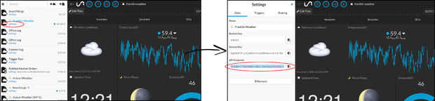 Haga clic en el enlace "configuración" bajo el nombre de cubo en el estante del cubo. Esto le llevará a la pantalla anterior. Copia el texto en la sección API Endpoint y pegarlo en su editor de texto favorito. Usaremos esto para construir una dirección URL que podemos utilizar para enviar datos en nuestro cubo y tablero de instrumentos existentes. En mi cubo, parece el texto que he copiado: https://groker.initialstate.com/api/events?accessKey=bqHk4F0Jj4j4M4CrhJxEWv6ck3nfZ79o&bucketKey=shwu1 la URL tendrá su clave de acceso y bucketKey. Tenemos que añadir un nombre de secuencia y un valor a los parámetros de URL para completar la dirección URL.
