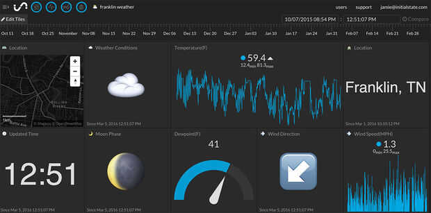 Fácilmente podemos añadir una ficha de mapa a nuestro panel de control que muestra la ubicación de la corriente del tiempo. Usted puede aprender más acerca de la vista de mapa interactivo de azulejos athttp://support.initialstate.com/knowledgebase/articles/800232-tiles-map-view. Simplemente podríamos añadir una nueva declaración de streamer.log en nuestro script de Python (y voy a explicar cómo hacerlo al final de esta sección). Por el contrario, aprovechamos esta oportunidad para mostrar una forma diferente de enviar datos en tu panel de control.