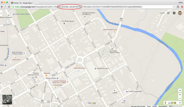 Es necesario obtener las coordenadas de latitud y longitud de tu ubicación. Una manera de hacer esto es ir a Google Maps, búsqueda por su ubicación, y acercar a su localización exacta. En la dirección URL, usted verá sus coordenadas de latitud y longitud. En el ejemplo anterior, mis coordenadas son 35.925298,-86.8679478.
