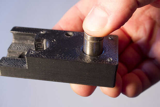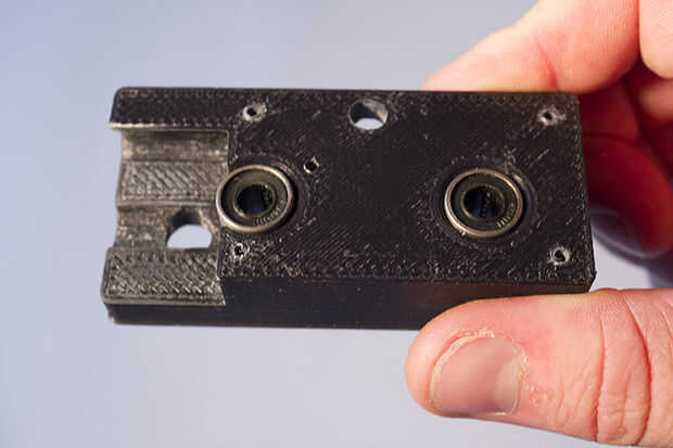 Empuje un rodamiento lineal en uno de los orificios de la abrazadera que desliza. Debe caber firmemente y requieren algunos fuerza para moverse, pero dependiendo de su configuración de impresión que necesite lijar un poco para conseguirlo.