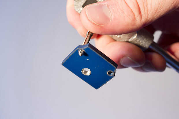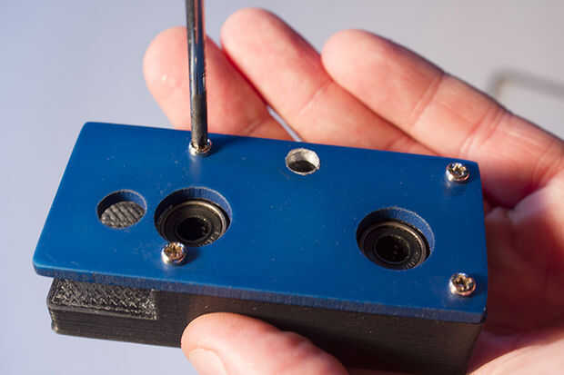 Uso 4 del M3 x 6 tornillos para sujetar la placa superior corredera de prensa a la prensa deslizante. Dependiendo de la configuración de impresión puede que necesite hacer un pequeño agujero piloto usando un taladro o una cuchilla afilada.