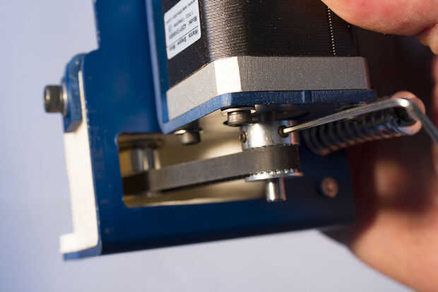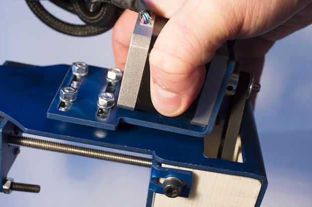 Deslice el montaje del motor paso a paso a lo largo de los tornillos hasta que tensa el cinturón de GT2. Apriete las tuercas M5.