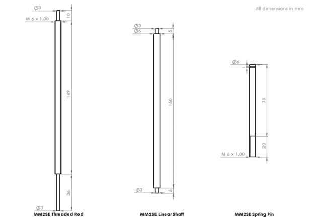 Estos deben trabajar a máquina de acero inoxidable y se pueden hacer en un torno. La parte superior de la varilla roscada debe tener el hilo eliminado para no pelar el plástico en el montaje superior y gira con poca fricción, y la parte inferior tiene que ser torneada para caber a través de los cojinetes y montar las poleas de GT2. El eje lineal debería caber estrechamente con ningún movimiento vertical en la parte superior y parte inferior aumenta, sin embargo usted podría considerar impresión / perforación de orificios en el soporte a la anchura de los árboles eliminando la necesidad de enganche. El pasador debe tener sólo los hilos y el surco del anillo elástico, sin embargo, usted podría considerar un anillo de seguridad de la impresión y esta roscado en la parte posterior del perno en su lugar.