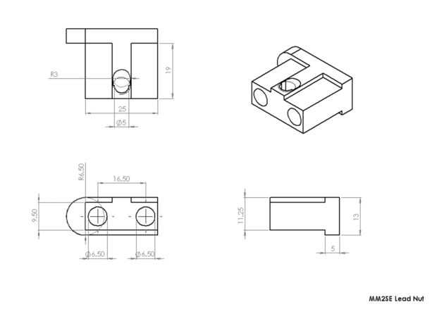 Esto puede trabajar a máquina de cualquier plástico de ingeniería que es bueno para sostener un hilo - usé acetilo y un molino. También hay una tuerca de cable más simple en el repositorio que se puede hacer por el acetilo de corte a la medida y utilizando una prensa del taladro o cuidadosamente con un taladro para agujerear los agujeros que luego pueden ser roscados. La tuerca de plomo requiere este espesor y ancho para un calce en el desplazamiento de prensa, colocación precisa de la rosca y el agujero de detrás de él, pero incluyendo un canto ayuda a guiar la tuerca en su lugar. Pueden perforar los agujeros en la parte delantera a cualquier diámetro de la primavera decide usar.