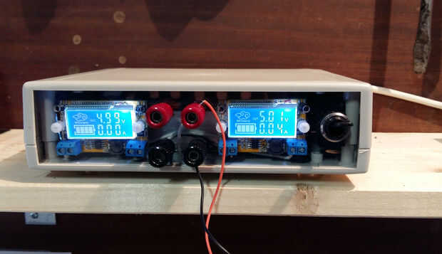 - Conecte la salida del cargador #1 a la entrada del convertidor de paso descendente #1. Tenga cuidado de respetar las polaridades de los cables. Utilice un multímetro para comprobar la polaridad de los cables de salida.