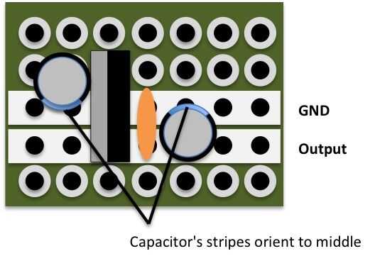 Cuando haces tu espacio de soldadura, los reguladores individuales aparte para facilitar la disipación de calor. Unos pocos centímetros está bien. Usted querrá mantener sus condensadores de filtrado como cerca de sus reguladores como sea posible, preferiblemente en primer plano si usted quiere colocar un disipador de calor a la parte posterior (plano). Pasador del 'GND' de su regulador debe ser en el medio, así también asegurar el pasador (rayados) negativo de 10μF condensadores orienta al centro del regulador. Si tienes pistas de side-by-side en su tabla de rendimiento, puede colocar las clavijas 'Tierra' y 'Salida' en las pistas. Todo esto puede verse por encima.