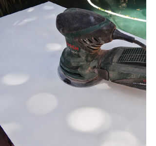 Antes de pintura a pistola siempre aplicar una capa de imprimación de pintura acrílica. Esto sólo hace que el supawood menos absorbente y usar menos pintura en aerosol para cubrir. Después de dejar la pintura seca, se puede lijar con una lija 240 utilizando un orbital o lijadora excentrica para un liso sedoso acabado. Trapo limpio para eliminar todo rastro de polvo.
