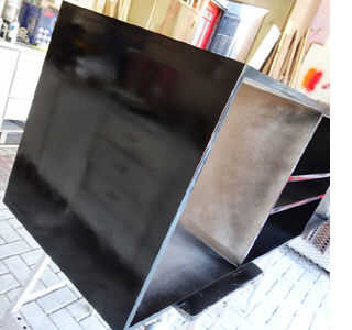 utilicé Rust-Oleum 2 X negro satinado cañón para todo el gabinete. Sólo aplicar luz, incluso capas sobre la superficie, rociar de arriba a abajo y de izquierda a derecha. Traslape cada movimiento para que la pintura se mezcla para un acabado uniforme.