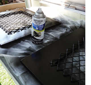 Pintura la malla y la puerta con dos capas de Rust-Oleum 2 X cañón de satén negro y luego a la malla de la parte posterior de la puerta con los clips antes de rociar sobre una capa final de pintura de aerosol de aerosol.