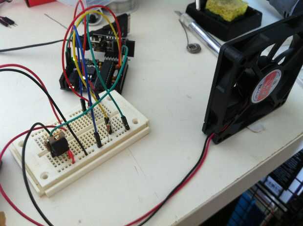 En esta configuración, se utilizan tres pines de Arduino. PIN 3 proporciona alimentación al LED. Pin 2, como entrada, detecte la presencia o ausencia de los rayos directamente. Pin 5 suministra corriente a la "base" del TIP120, que permite actual para fluir del "colector" a "emisor" y activando el motor del ventilador. Resistencias en serie con el LED y el TIP120 impiden demasiado corriente que fluye a través del microprocesador delicado. La resistencia y el fototransistor forman un divisor de tensión que se de entrada a la Arduino en presencia de luz IR.