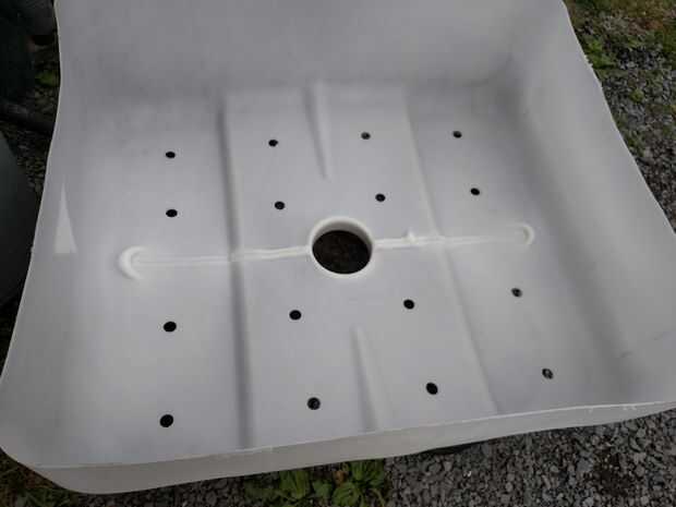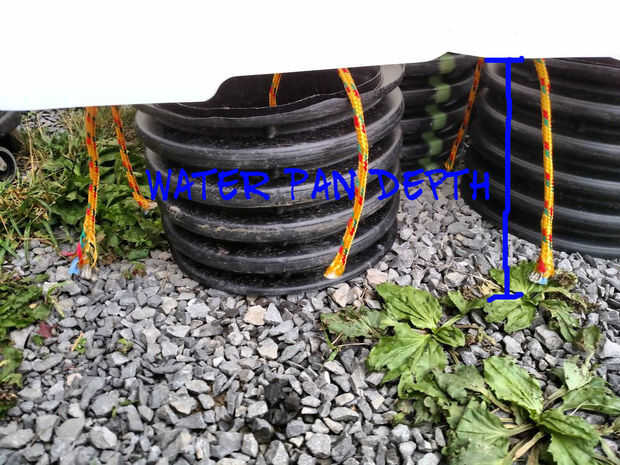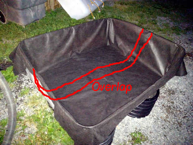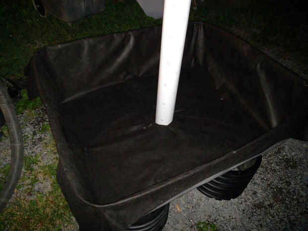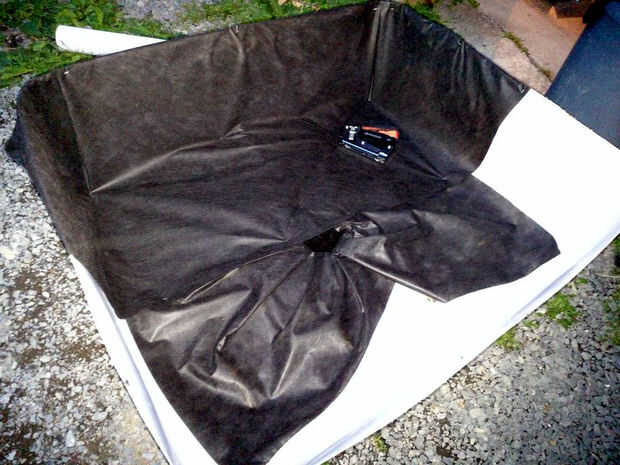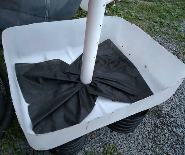 A continuación, se línea el pan de suelo con la tela del paisaje. Corte una longitud de tela 68"(longitud de la bandeja de suelo + 2 x profundidad del depósito de agua). Coloque a la tela en la bandeja del suelo, centrado en el orificio de llenado de 6". (Si usted no lo ha hecho, retire el tapón de llenado. Una llave de correa o llave de tubo grande puede ayudar con esto.) Usando una mano abierta, o un tubo de diámetro cercano al puerto, empuje el tejido hacia abajo hasta que se a través del puerto lo suficiente como para tocar el fondo del depósito del agua. (Esto es más fácil si el pan de tierra se ajuste en las ayudas, en el marco o en el suelo). Engrape a la tela a la bandeja del suelo alrededor del orificio de llenado y los bordes de la tela.