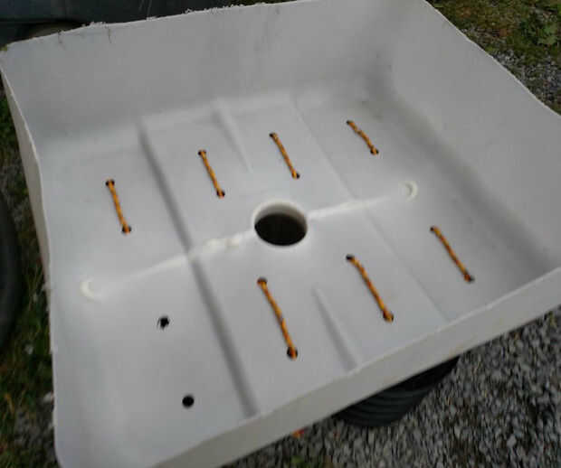 En primer lugar, usted necesitará perforar los agujeros de drenaje/mecha en el recipiente. 16 perforaciones que son dos veces el diámetro de la mecha de cuerda; espacio uniformemente en cuatro filas de cuatro. Deje espacio alrededor de la lumbrera superior de 6" servirá como su mecha principal. Espacio también los agujeros para que no sean obstruidas por sus soportes en la bandeja del agua.