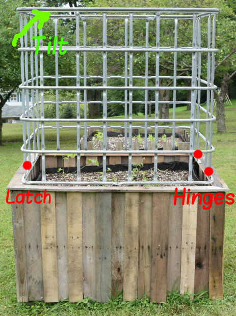 Como se sienta, la jaula es ligero, por lo que se desea encontrar un método que fije a la jardinera. Voy a colocar en un extremo con correas de tubo para hacer las bisagras. Entonces podré incline la jaula encima de y lejos de las plantas para mantener y cosechar según sea necesario. Esto requerirá colocar que las bisagras lo suficientemente cerca para el borde que activa la parte superior de la jaula se apoye sobre el piso. De lo contrario, puede dejar la jaula centrada y utilizar un remanente de la plataforma para hacer un soporte para sostener el peso de la jaula cuando se inclina.