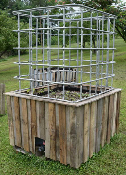 Puede volver a utilizar la jaula de la IBC para crear una jaula protectora / efecto invernadero / parcial enrejado para el plantador. Aquí está cómo lo hice para el mio: