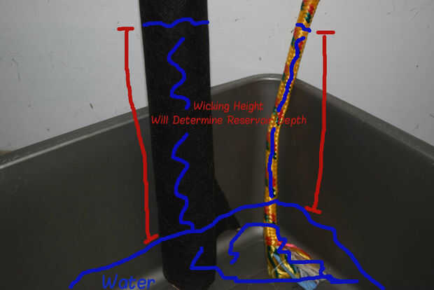 * Para configurar un material wicking prueba, colgar un pedazo largo de cuerda o tela encima de un recipiente de agua con el fondo o dos pulgadas en el agua. Asegúrese de que el pan completo para que la columna puede tirar tanta agua como sea posible. Después de un día o dos, medida como muy por encima de la superficie del agua el material está húmedo. Esta debería ser la altura máxima que el material puede absorberá agua. Debe diseñar el tanque de agua sea menor que esta altura.