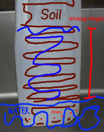 * Para probar las capacidades de absorción de mezclas de suelo, necesita hacer una columna de suelo. Se puede utilizar un cilindro de plástico o botella o una tela que no se absorberá agua. Si usa una botella de plástico, usar algo alto y haga pequeños agujeros en la parte inferior. Rellenar con el suelo y sentarse en un recipiente de agua. Asegúrese de que el pan completo para que la columna puede tirar tanta agua como sea posible. Después de un día o dos, medir desde la parte superior del agua en la bandeja a la parte superior de la tierra mojada en el frasco. Si es difícil ver una línea húmeda en el suelo, utilice un medidor de humedad de suelo ($10 en Lowe) a partir de la parte superior y mover más profundo en el suelo por 1/2" en un momento hasta que vea un aumento notable en la humedad. Que punto la altura de su suelo puede mecha y debe ser mayor que la profundidad de su bandeja de suelo en este plantador.