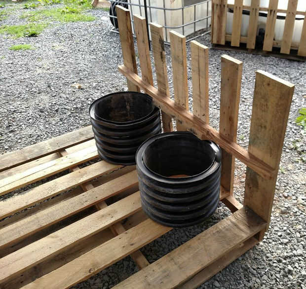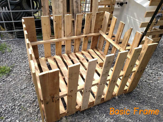 Para construir el marco básico para el plantador, utilizas las cuatro paredes que se hicieron sólo por desmontar los palets. Tomando las dos paredes largas, Conecte cada uno a cada lado largo de la plataforma base que fue ranurada. Permitir que las tablas se superponen a los lados de la plataforma base de 2" y cada tabla a la base del clavo. Para hacer esto más fácil, usé unos pedazos de mis soportes de alcantarilla para sostener la pared lateral a la altura correcta.