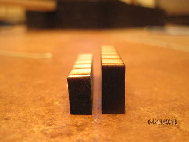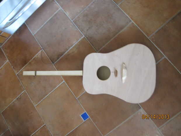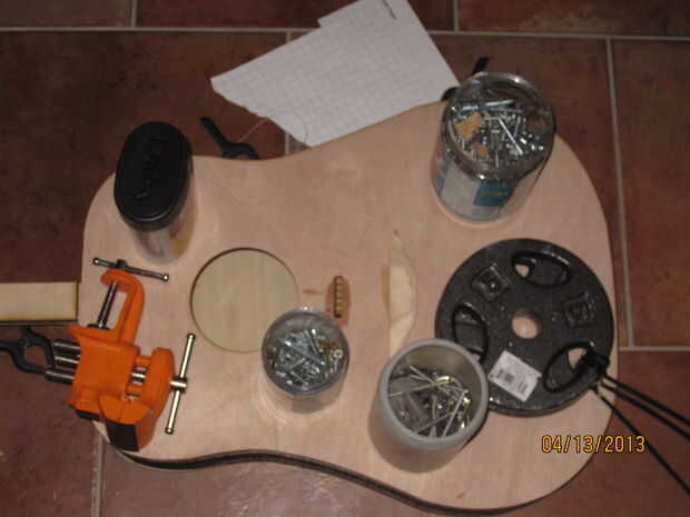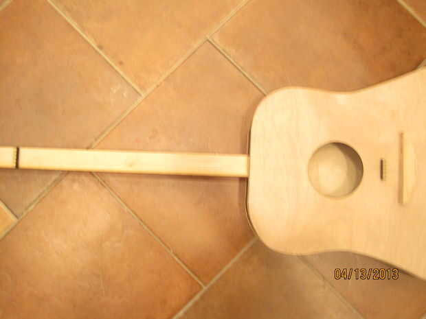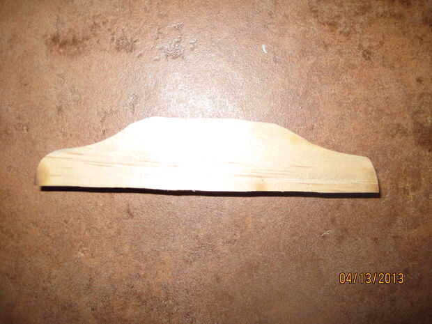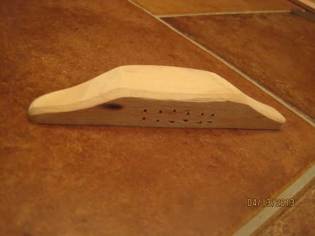 La distancia entre la tuerca y el puente es de unos 26". Esto es la longitud de la onda al vibrar. Mida 8" hacia abajo desde la parte superior del cuerpo hacia el centro y cerca de 18" desde donde se unen el cuerpo y el cuello. Trace una línea en ambos de estos puntos. Para la tuerca, usé Corel draw una vez más recortar un rectángulo y arboledas en él para las cadenas en. Las ranuras son aproximadamente 1/4" de uno a. Una vez cortado, la tuerca de 3/16" de altura de arena. Super pegue esto a la línea trazada en el cuello. Sujete la tuerca hacia abajo y deje que el pegamento seque. Para el puente, cortar la tuerca otra vez, pero esta vez la arena hasta sólo 1/4" de alto. Esta diferencia de altura entre la tuerca y el puente permite más espacio para rasguear la guitarra al tocar. Pegamento estupendo esta pieza hacia abajo en la línea trazada en el cuerpo. Apretar y dejar secar. Esto nos da nuestra 26" longitud entre la tuerca y el puente. Una vez seco, retire la pinza y hacer la parte del puente que sujeta las cuerdas. Había trazado la forma de un puente de una imagen en línea en el 1/2" madera y recortarlo. Debe ser aproximadamente 5" de ancho. Entonces, usando la tuerca como una guía, marcado dónde perforar los agujeros para las cuerdas ejecutar a través de. Taladré los orificios con un taladro pequeño para que las bolitas en los extremos de cuerdas de la guitarra no se ajusta a través de. Una vez que haya perforado los agujeros, forma el puente con una lijadora para darle una forma más fluida. Entonces, pegué detrás del puente con pegamento y pegamento de madera, ya que es la articulación más importante de pegamento en todo el proceso. Si no se utiliza suficiente pegamento, el puente será arrancado del cuerpo de la guitarra de la gran tensión de las cuerdas. Una vez que el pegamento se haya secado y todo es correcto, el pegamento en la parte superior con pegamento para madera y pesan arriba de un fuerte vínculo.