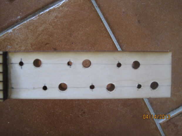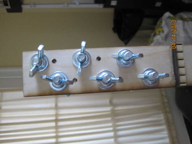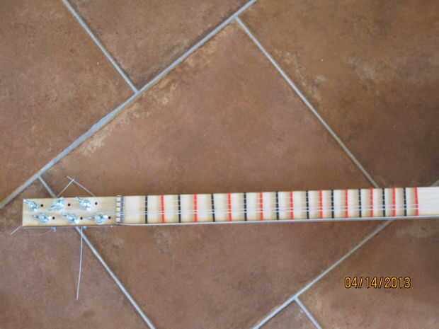 No cortar el cuello antes de que pegué en así fue aproximadamente de 8" de demasiado tiempo, así que corte ahora. Entonces sacó de mi diseño del sintonizador. Están en dos filas, cada 3/8" del borde. Los sintonizadores se compensan para que no golpeen entre sí y unos 3/4" a. Luego marqué para agujeros de 1/2" delante de los sintonizadores. Estas son para que las secuencias pasar y llegar a los sintonizadores. Taladré los agujeros para los sintonizadores con un 5/16" pedacito de taladro y los agujeros para las cuerdas eran aproximadamente 1/8". Los afinadores están montados con el lazo en la parte inferior del cuello. De eso va una arandela de 1/4" y luego a través del cuello. En la parte superior va una 1/4" arandela y una tuerca mariposa. Esto se repite para todos 6 sintonizadores. Los trastes son 1/8 "X 1/8" X 1 1/2". Mina están hecha de acrílico rojo y negro, cortar con un cortador láser. Para la colocación, sólo utilicé una calculadora de traste en línea tales como http://www.studybass.com/tools/chord-scale-note-printer/ o http://www.stewmac.com/fretcalculator?gclid=CMnShKaoy7YCFQNlMgodZB4AdQ. Te dan todas las mediciones a Coloque correctamente los trastes de la guitarra. Medir la distancia, dibujar una línea y pegamento estupendo el traste en su lugar. Fijarlo con la abrazadera hacia abajo para un enlace seguro, como estas piezas recibirá un montón de desgaste. Y eso es todo, la guitarra se hace!
