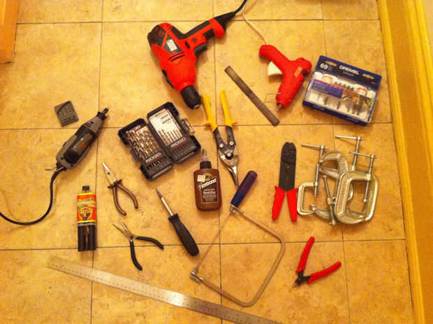 También, puesto que no tengo ninguna herramienta de gran potencia, tuve que ser capaces de hacer en mi cocina usando herramientas de mano que ya tenía. (salvo el diapasón que había cortado para mí de un trozo de madera contrachapada en una ferretería)