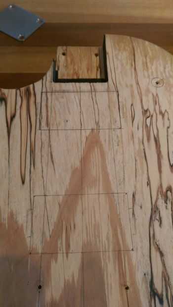 Es importante al doble o triple Compruebe su marca antes de la perforación o corte como no quieres arruinar tu nueva guitarra. Como se puede ver en las fotos, han hecho las posiciones de los potes de tono y volumen y las recolecciones. También llevé las líneas del cuello hacia abajo a través del cuerpo para asegurarse de que el cuello iba a ser centralizado en el cuerpo.