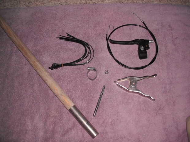 Se necesita: palanca de freno de 1 w/perca cable de freno 1 abrazadera de 1 3-zipties 1-abrazadera 1 fregona o escoba mango perno de carruaje de 1 pequeño con tuerca y arandela Pedacito de taladro Taladro