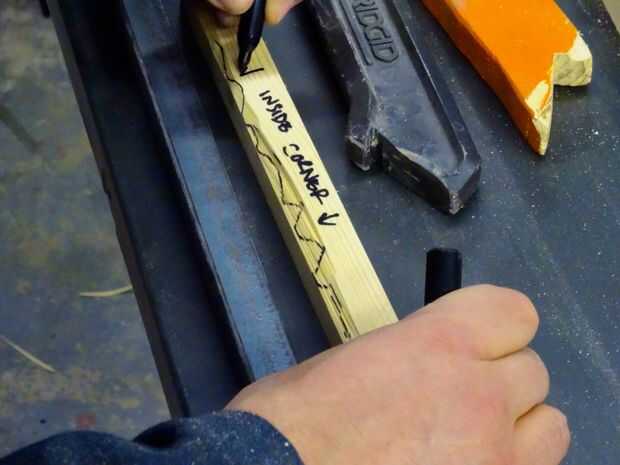 Estamos utilizando una sierra de cortar metal para tratar de que nuestros ángulos de 45 grados y la abrazadera y la guía de la sierra no toman amablemente a la extraña geometría de ángulo de hierro. Por esta razón estamos cortando hasta cierto stock de 2 "x 4" para llenar el espacio negativo. Esto nos ayuda a bloquear el metal en la sierra y nos da más recortes repetibles.