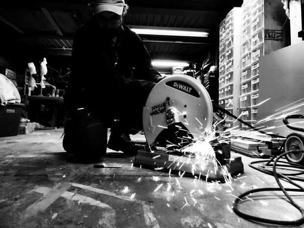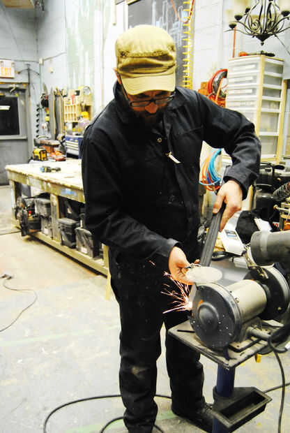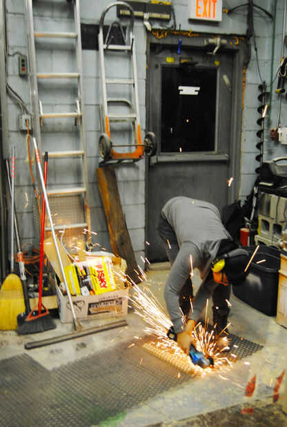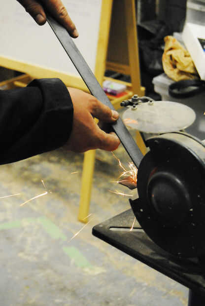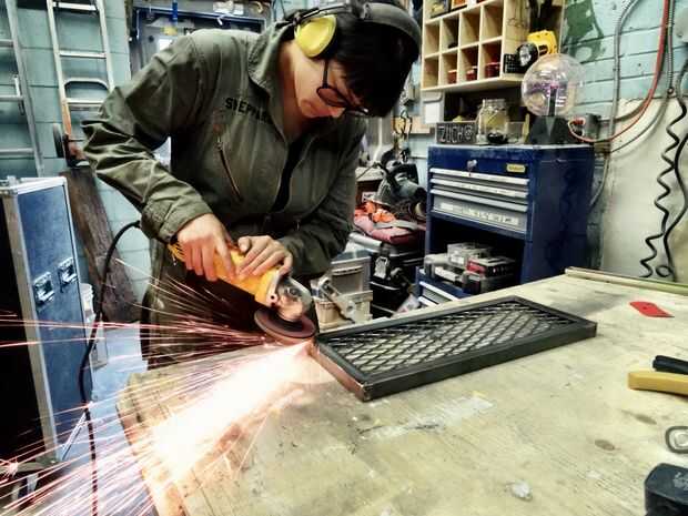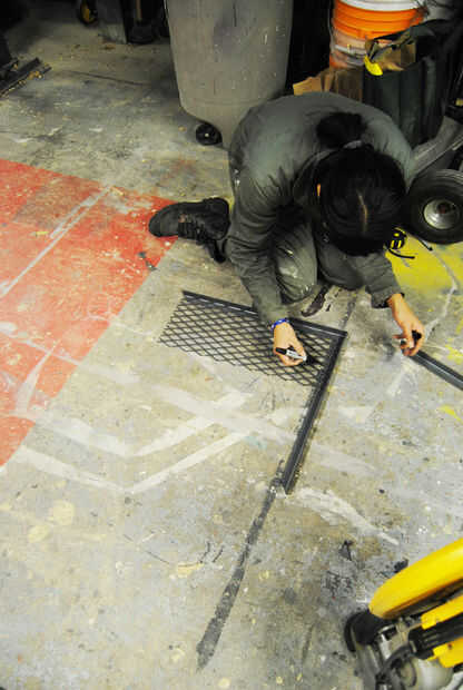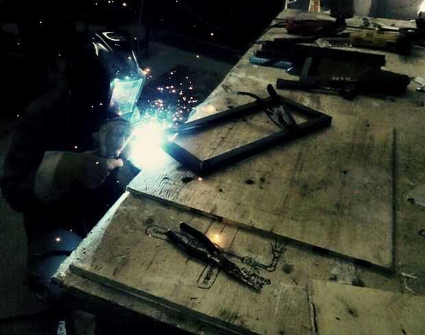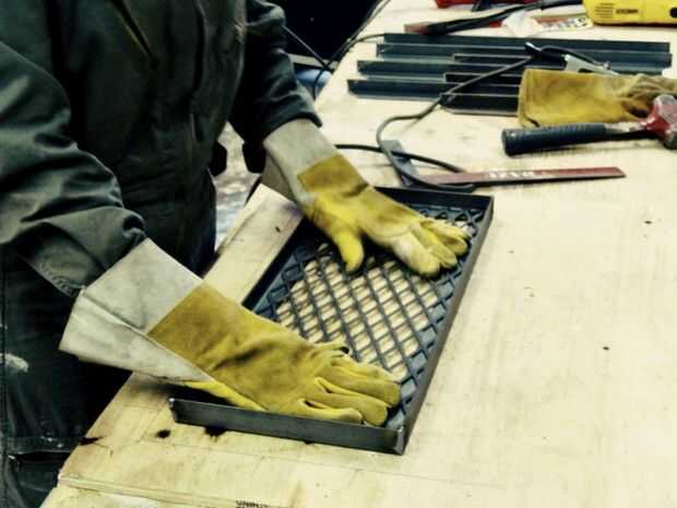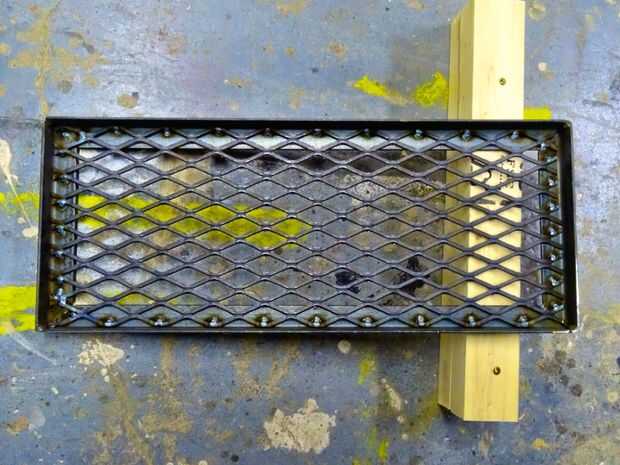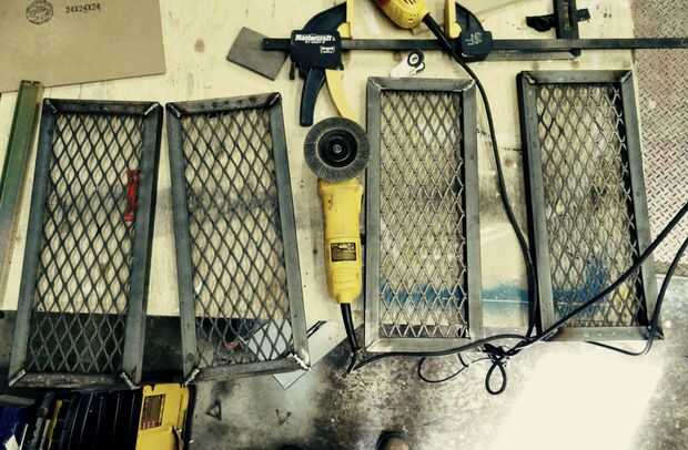 Ahora que tenemos todas las piezas del marco cortado, Tina y Nate atacar la malla expandida y cortar rectángulos. El paso siguiente es soldar los marcos juntos e insertar los rectángulos de la malla. Estos conseguirán soldados en ángulo de hierro. El último paso es moler el salpicón y soldaduras bulgy.