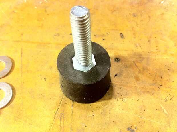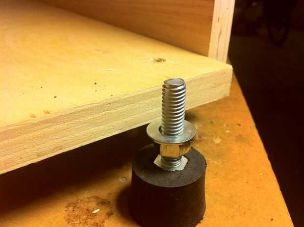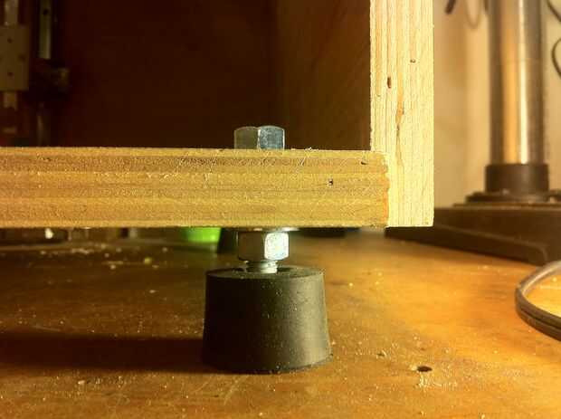 Puede utilizar almacén comprado patas niveladoras o hacer simplemente con un tapón, tornillo, 2 arandelas y 2 tuercas. Siguen las fotos de arriba. Taladro justo en el tope de lejos bastante para caber la cabeza del perno entonces taladro los agujeros en la parte inferior de la caja. Utilice una burbuja de bullseye nivel al caso, colocando en el centro de la parte inferior luego gire la tuerca de fondo en cada pie para conseguir el nivel del caso.