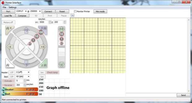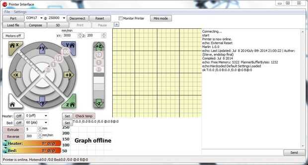 En Pronterface Compruebe que están seleccionados el puerto correcto y la velocidad, el puerto será la misma utilizada para descargar el firmware para el Arduino, la velocidad debe ser de 250000. Haga clic en el botón "conectar". En el lado derecho verá el software conectar y detectar la Junta rampas. Buscar autor: debe ser igual a lo que pones en el archivo Configuration.h. Usa las flechas de movimiento X, Y y Z y tratar de mover los motores - trate de mover 1mm o 10mm por el momento. Como mover el ratón sobre la cuadrícula de X, Y y Z se destacan las direcciones y distancia. No trate de inicio de los motores en este tiempo - usted tendrá que poner topes sobre el tablero de rampas, es decir, no haga clic en el icono "Inicio". Si mueve accidentalmente demasiado los motores y llegar a un límite de viajes y tratar de seguir adelante solo Desconecte la fuente de alimentación o pulsar el botón reset en el tablero de rampas.