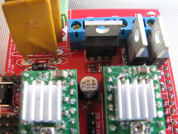 El calor puede tirar un poco sobre 9A de la corriente y es controlado por un MOSFET en el tablero de rampas. (12v / 1,3 ohmios = 9.2A). Encontramos la norma que stp55nf06l tiene muy caliente incluso con un disipador térmico. Después de leer unos reprap hilos de foro en este tema que hemos decidido cambiar el MOSFET a un IRLB8743PBF y encontrar el problema desaparecieron. El circuito también está protegido por un fusible reseteable de 11A - el circuito de la extrusora está protegido por un fusible de 5A similares. Ver las imágenes. Este fusible también se calienta al tacto y si el circuito tira amperios máximo calentar y ampliar y romper el circuito. Encontramos que teníamos que tener un ventilador pequeño soplo de aire sobre los fusibles para mantenerlos frescos durante el calor inicial hacia arriba de la cama. Una vez que hicimos esto se calienta no hay problema. Podemos mirar de cambiar el fusible hacia fuera a una unidad de 15A más adelante.