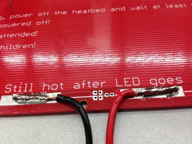 En nuestra estructura que vuelta la cama para que los 12V de la soldadura cojines estaban en la parte posterior de la impresora - esto fue así que los funcionamientos de cable eran más cortos y no corrían debajo de la cama sí mismo. Utilizamos el mismo 16awg que se utilizó para ejecutar la fuente de alimentación 12V. Debe utilizar cables trenzados flexibles para la cama de calor 12V.