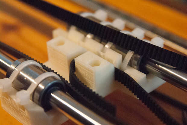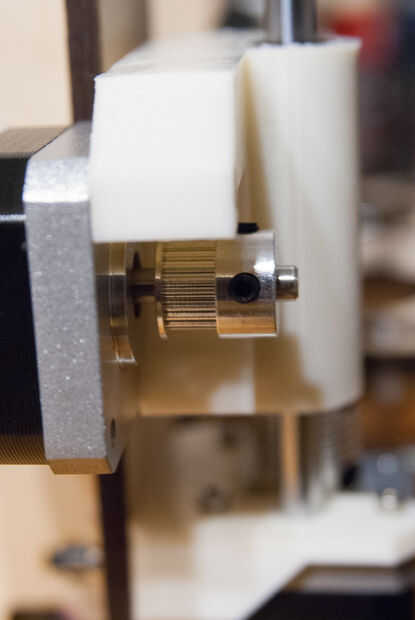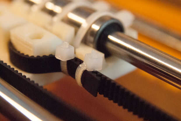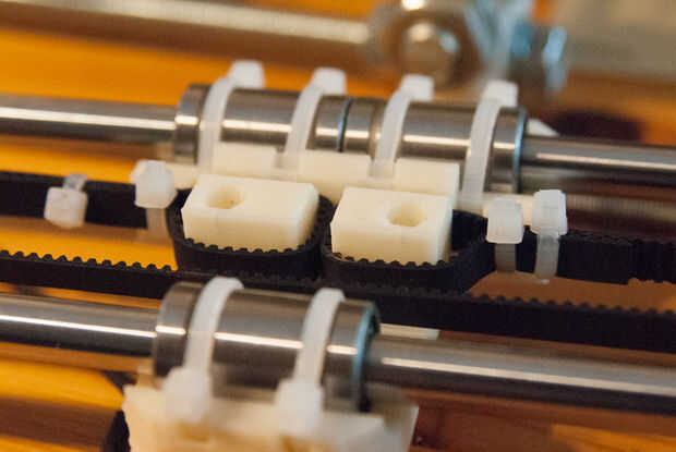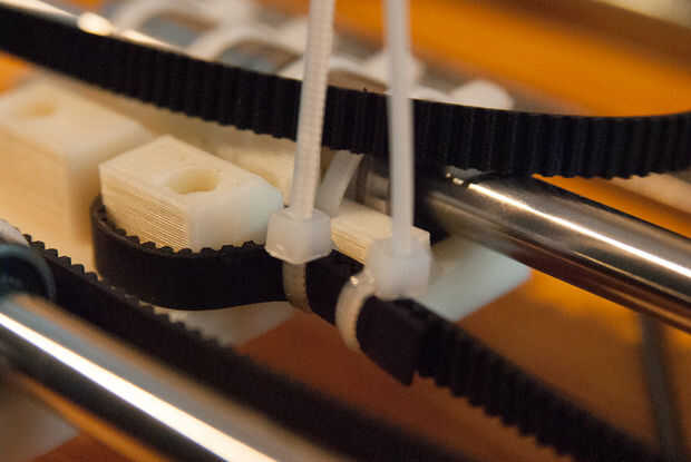 Fijar una polea GT2 a uno de la NEMA-17. Encontramos que la parte dentada necesita sentarse en el interior por lo que encajaría en la correa a través de las ranuras en los extremos de la X. Montar el motor con 3 x 18mm que tornillos M3. El cinturón según los cuadros asegurándose de que lo de la tensión del hilo de rosca. Comienzan en el carro X y presione la cinta en las ranuras lo mismo que usted hizo para la correa Y. Pasar alrededor de la polea del motor, la rueda loca y al carro de X. Utilice zip lazos para mantener en su lugar según las imágenes. Era difícil conseguir buena tensión en la correa de X y probablemente vamos a imprimir este diseño del tensor una vez depende de la impresora y trabajo.