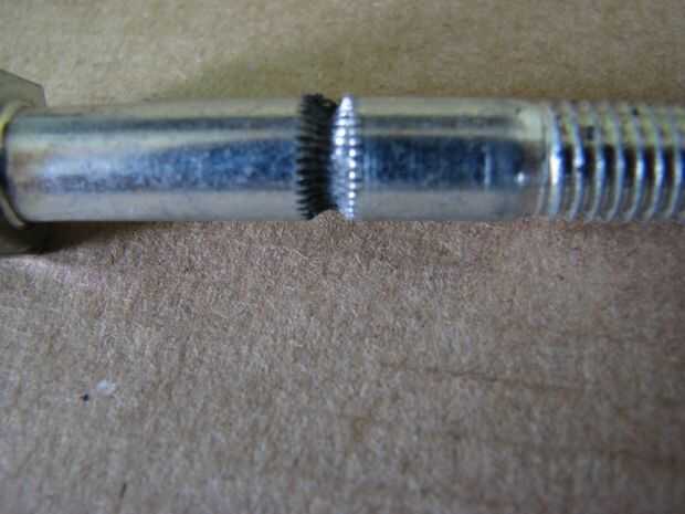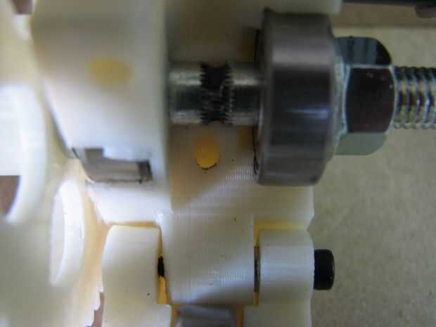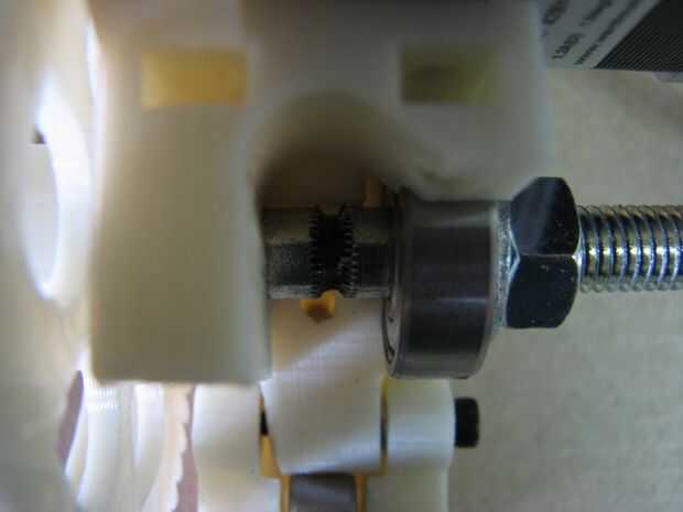 El tornillo de M8 hobbed encaja en el engranaje grande y a través de un cojinete 608 en la pieza de extrusión grandes. Deberás agregar arandelas de cuña entre el engranaje y el 608 cojinete para asegurarse de que la fresa se alinee con el agujero para el filamento. Una segunda 608 cojinete mantiene el perno en su lugar. Prueba de ajuste y acuñe según sea necesario. Use un nylock M8 o 2 M8 Pernos regulares ceñidos juntos para sostener la hobbed del perno en su lugar.