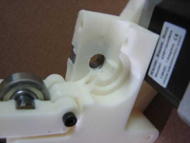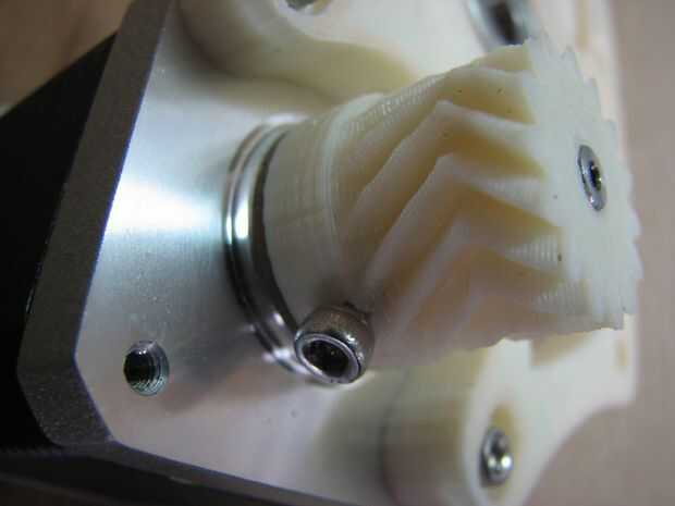 El pequeño engranaje encaja en el eje del motor, hay que escariar el agujero hacia fuera un poco para un buen ajuste. Una tuerca M3 va en la ranura en el lado del engranaje pequeño y un M3 x10mm perno tornillos para sostener el pequeño engranaje contra el eje del motor. Nos presentó una cara plana en el eje del motor para ayudar a sostener el pequeño engranaje al eje del motor, si el eje del motor no tiene una cara plana en ella debe presentar uno sobre él. Si no entonces el engranaje se deslice sobre el eje y el filamento no saca correctamente.