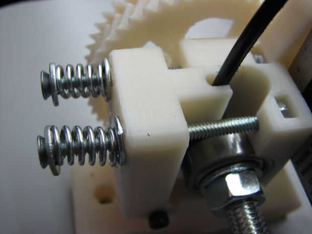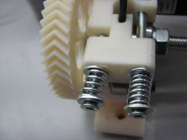 Perno del motor de la extrusora y prueba de ajuste los engranajes para asegurarse de que alinee - sólo asegúrese de que el perno de hobbed ha sido prueba equipado primero y que el hobb se alinee con el agujero para el filamento, y asegúrese de que el pequeño engranaje se ajuste y acoplamiento con el engranaje más grande. Hay ranuras en el cuerpo principal de la extrusora donde encajan las tuercas de 6-32. Tuvimos un poco de material de nuestro para hacerlos resbalar en su lugar, ver las fotos de archivo. Montar las 2 x largo 6-32 tornillos a través de las arandelas y los resortes. La tensión correcta no se conocerá hasta probar y calibrar el motor de la extrusora.