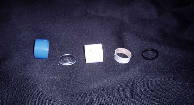 el casquillo de extremo plástico negro se desliza en el tubo de cartón. la lente va en el tubo azul, que luego se coloca sobre el tubo blanco. el tornillo va a mantener en su lugar, y eres bueno para ir.